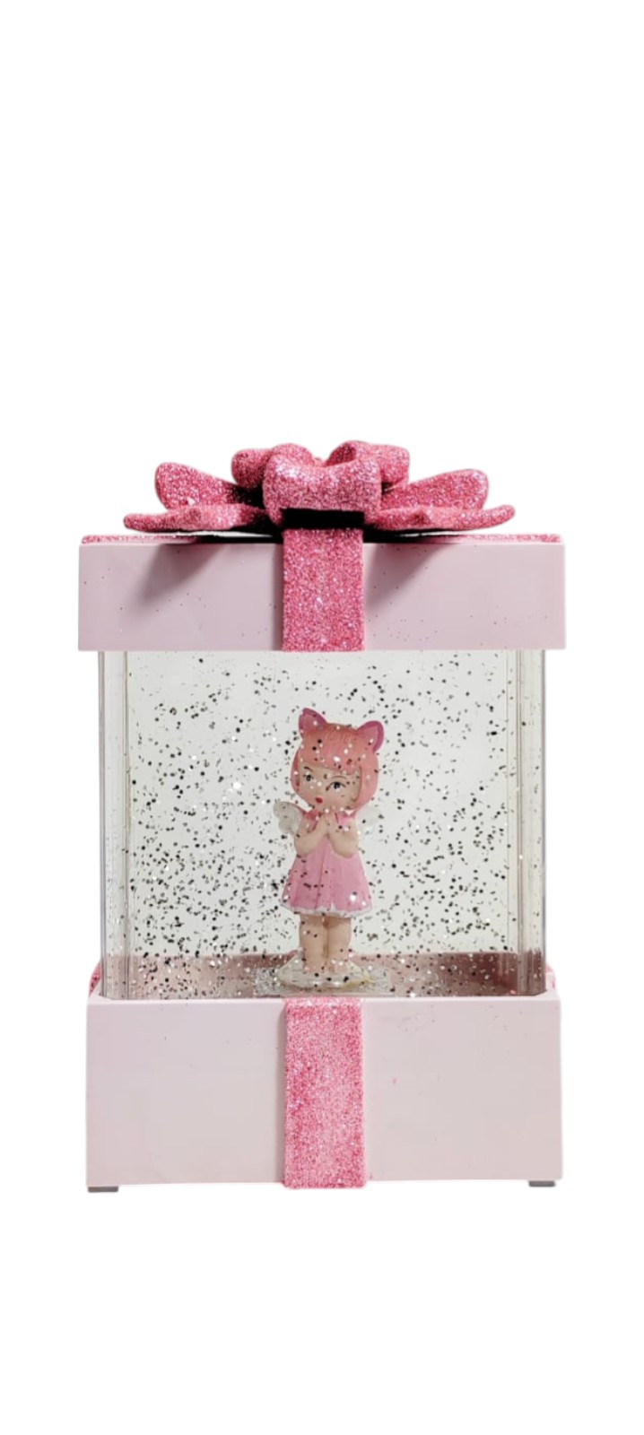 - The lantern’s clear glass panels highlight the playful scene inside, complete with shimmering glitter that sparkles when lit.