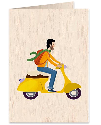 Wooden greeting card “Happy Man with Motorbike”. This card is made to wish your friends, Dad, brother and boyfriend a Happy Birthday.(NO TEXT INCLUDED)